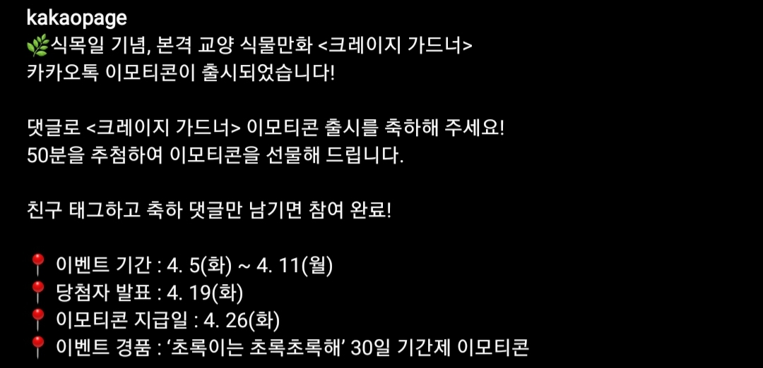 #무료이모티콘 #이모티콘무료다운 #카카오톡이모티콘 #이모티콘이벤트 #공짜이모티콘 #카카오이모티콘 #카톡무료이모티콘 #카카오톡무료이모티콘 #무료이벤트 #이모티콘 #무료증정 #임티 #공짜이벤트 #event #emoticon #4월이모티콘 #이벤트 #무료임티 #꿀팁 #freeemoticon #30일사용 #인스타그램이벤트 #댓글이벤트 #크레이지가드너 #초록이 #식목일