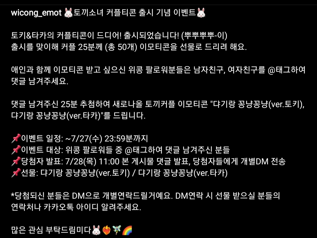 #무료이모티콘 #이모티콘무료다운 #카카오톡이모티콘 #이모티콘이벤트 #공짜이모티콘 #카카오이모티콘 #카톡무료이모티콘 #카카오톡무료이모티콘 #무료이벤트 #이모티콘 #무료증정 #임티 #공짜이벤트 #event #emoticon #7월이모티콘 #이벤트 #무료임티 #꿀팁 #freeemoticon #위콩 #댜기량꽁냥꽁냥 #토키타카 #토끼소녀 #커플티콘 #인스타그램이벤트 #무제한사용 #친구태그