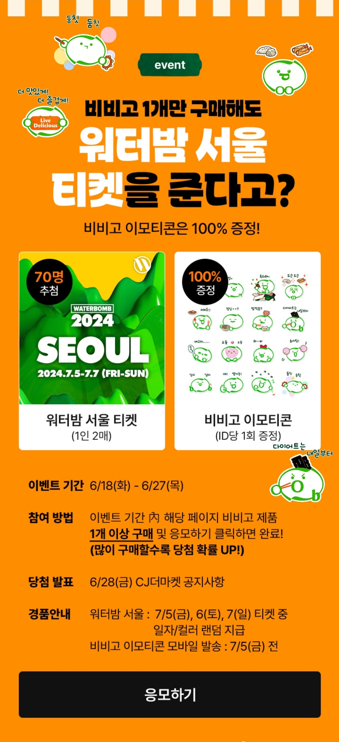 비비고 카카오톡 무료이모티콘 다운받는 팁 ~ 6/27(목) ➡️ 홈페이지 이벤트 ~7/5(금) 전 발송 ~6/30(일) ...