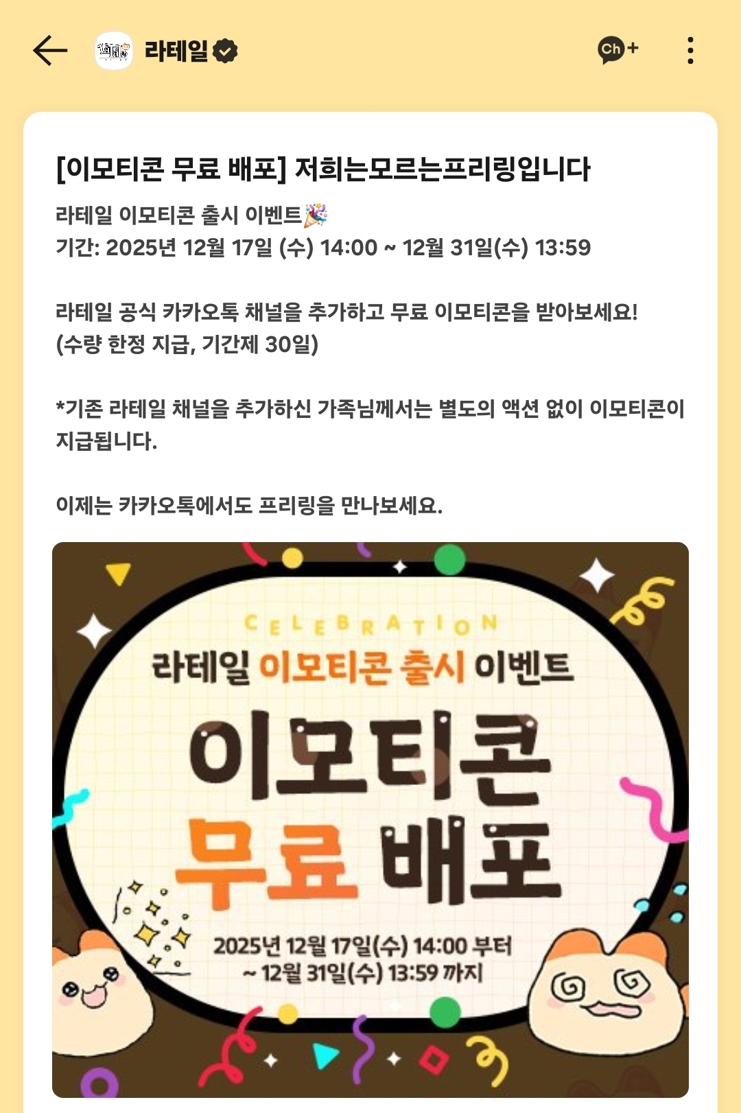 #무료이모티콘 #이모티콘무료다운 #이모티콘이벤트 #공짜이모티콘 #카톡무료이모티콘 #카카오톡무료이모티콘 #무료이벤트 #공짜이벤트 #12월무료이모티콘 #채널추가 #카카오톡채널 #라테일 #프리링