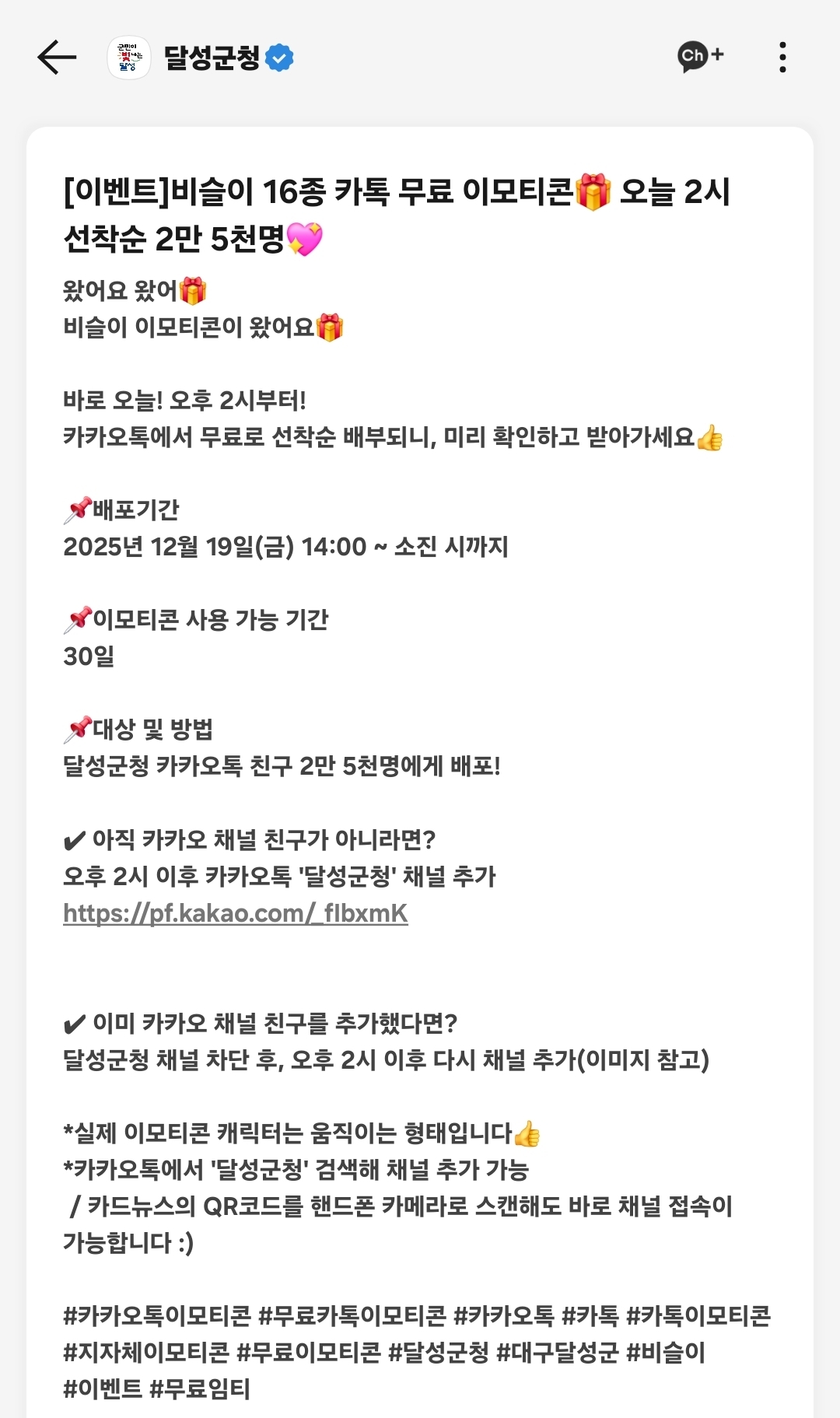 #무료이모티콘 #이모티콘무료다운 #이모티콘이벤트 #공짜이모티콘 #카톡무료이모티콘 #카카오톡무료이모티콘 #무료이벤트 #공짜이벤트 #12월무료이모티콘 #채널추가 #카카오톡채널 #비슬이 #달성군청