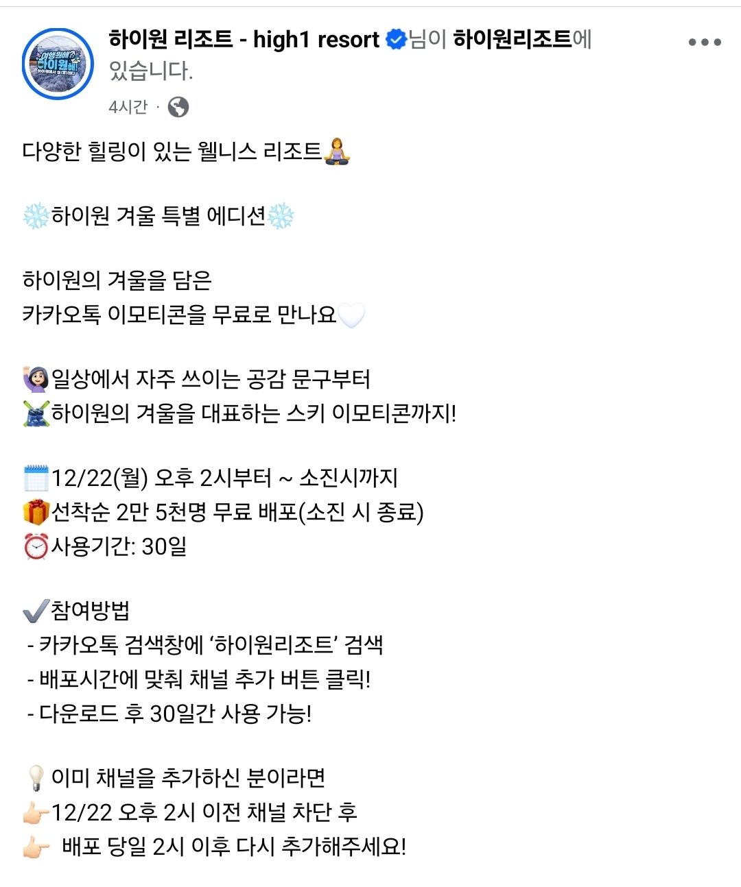 #무료이모티콘 #이모티콘무료다운 #이모티콘이벤트 #공짜이모티콘 #카톡무료이모티콘 #카카오톡무료이모티콘 #무료이벤트 #공짜이벤트 #12월무료이모티콘 #채널추가 #카카오톡채널 #하이원리조트 #겨울에디션