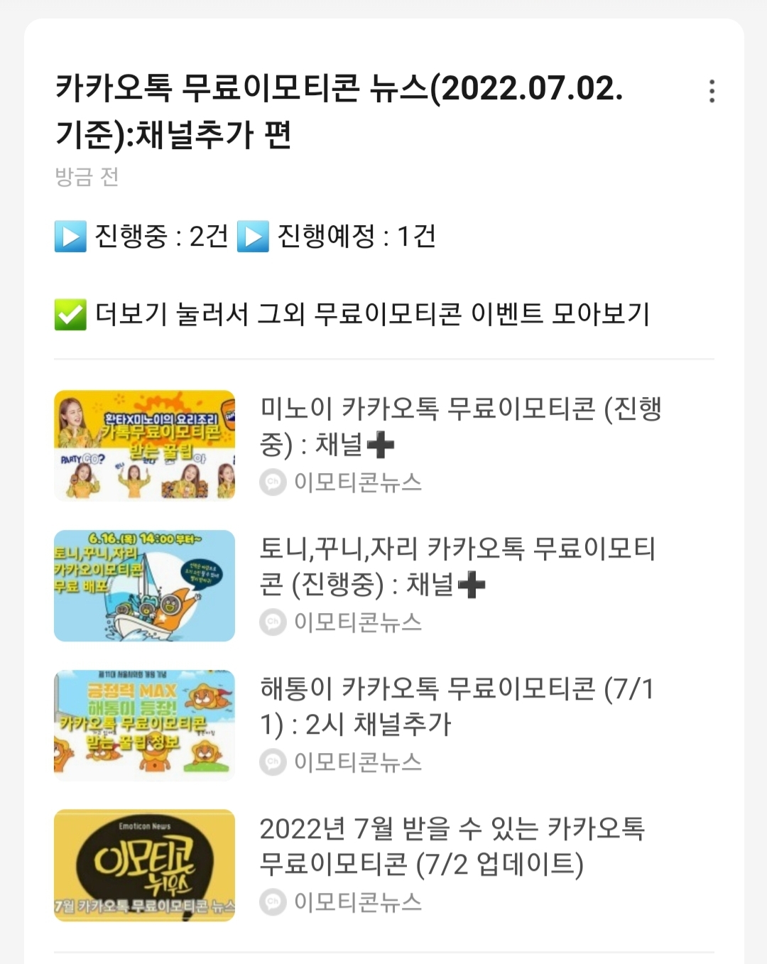 카카오톡 무료이모티콘 뉴스 [2022. 07. 02. (토) 기준] 채널추가 편 ✅ 진행중 2건 ✅ 진행예정 1건 (각 ...